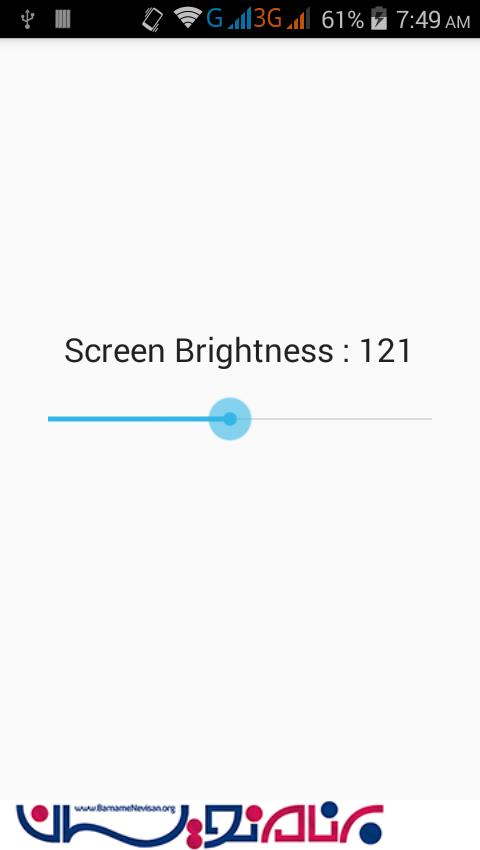 در این نمونه با استفاده از تابع setOnSeekBarChangeListener() می توانید نور صفحه تان را کم نمایید همان طور که می دانید برای کم کردن نور صفحه ی گوشی در قسمت نوار ابزار وجود دارد ولی با استفاده از این تابع می توانید این دسترسی را به اپلیکیشن های خود بدهید که از داخل اپلیکیشن نور صفحه کم شود.