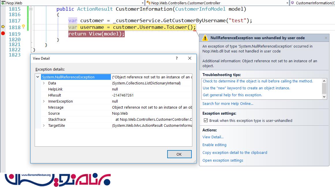 به عنوان مثال زمانی که کد های شما یک Exception صادر می کند، میتوان در پنجره ای که نرم افزار به شما نشان می دهد جزئییات زیادی از خطا را دریافت کنید.