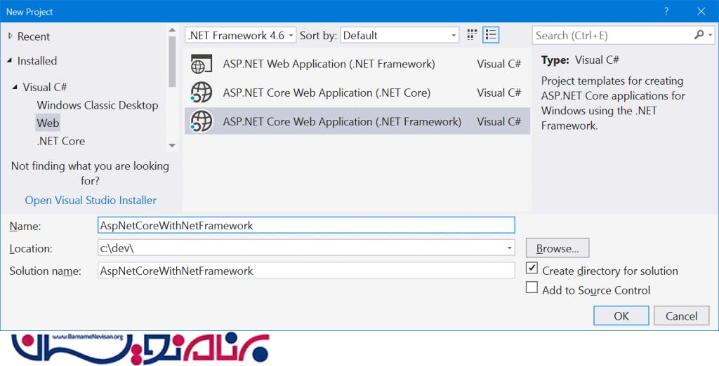 شما میتوانید برنامه های ASP.NET Core را با .NET Framework در قالب های Visual Studio انتخاب کنید.