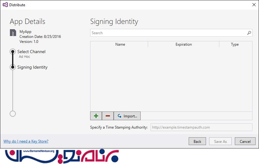 بعد از انتخاب ad-hoc حالا باید به صفحه ثبت امضا برای اپلیکیشن بروید می توانید یک گزینه ی جدید اضافه کنید یا اینکه یک اپلیکیشن دیگر را انتخاب نمایید