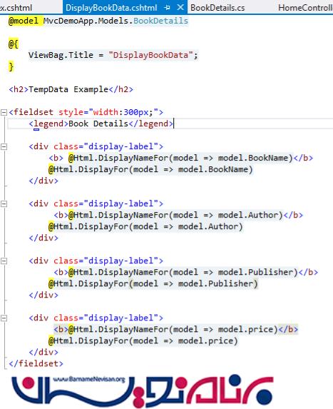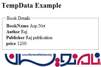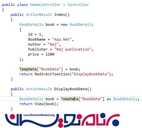 در مثال بالا، ما شی book را در داخل TempData ذخیره کرده ایم این عمل ذخیره در اکشن متد Index انجام شده و در اکشن متد دیگری با نام DisplayBookData که وظیفه نمایش اطلاعات کتاب را دارد، مقادیر داخل TempData را دریافت می نماییم.