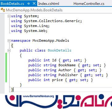 روی پوشه Models راست کلیک کرده و از منوی Add یک کلاس با نام BookDetails.cs بسازید و قطعه کد زیر را همانند تصویر در آن وارد نمایید.