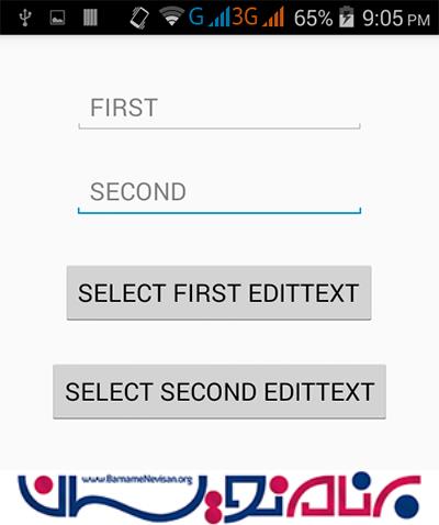 پنجشنبه 26 مرداد 1396در این مقاله می خواهیم با استفاده از focus روی Edittext ها یک مثال برای شما قرار دهیم به این صورت که شما دو تا edittext دارید و با زدن دکمه ی مورد نظر فوکوس روی edittext ها تغییر می کند.