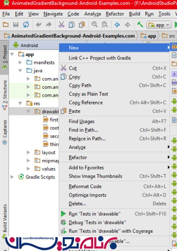 روی این پوشه راست کلیک نماییم drawable folder –>New -> Drawable Resource File