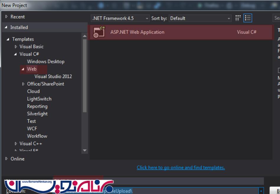 ASP.NET Web Application را انتخاب و نام پروژه خود را به FileUpload تغییر دهید.