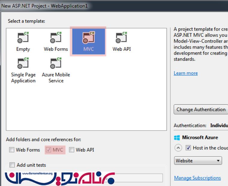 از قسمت Select a template گزینه MVC را انخاب کنید.