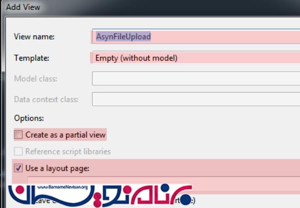 کد مربوط به View شامل کدهای jQuery را اضافه کنید. این کد ها Progress و فرآیند Upload فایل را کنترل میکنند.