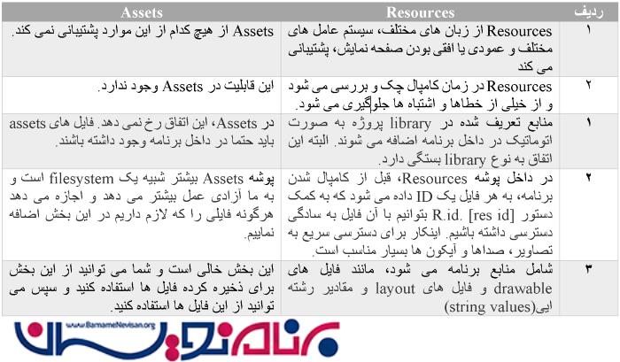 منابع(Resources) فایل های بدون سورس کد هستند و در زمان build شدن پروژه، به همراه دیگر کدهای پروژه، کامپایل می شوند و در آخر به صورت یک فایل APK بسته بندی می شوند تا بتوانیم این پروژه را در دستگاه های دیگر نصب کنیم.