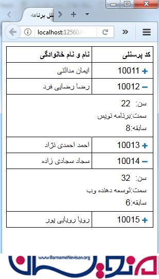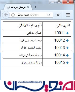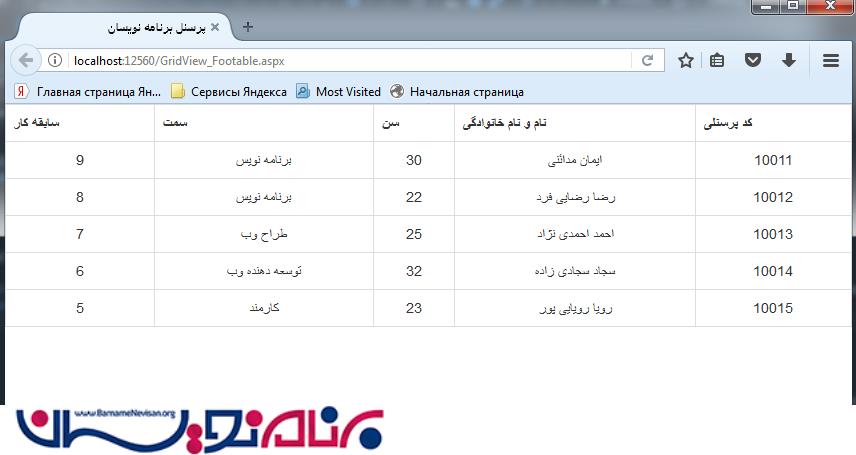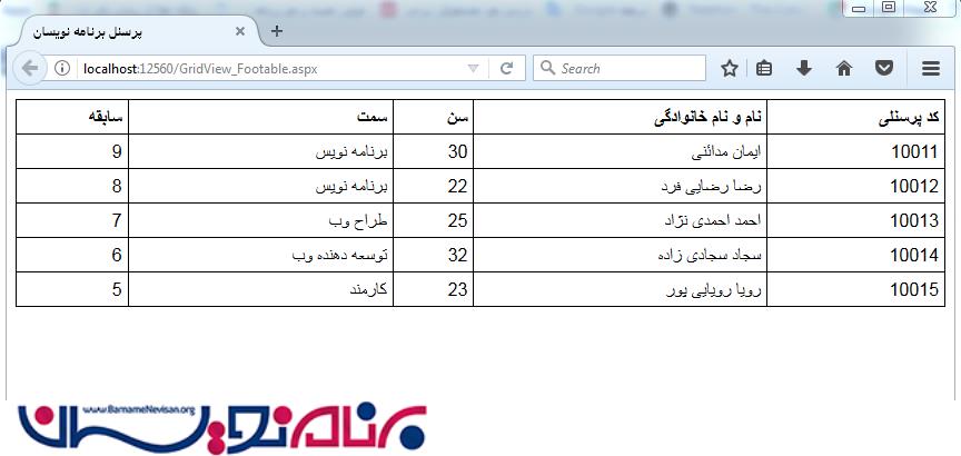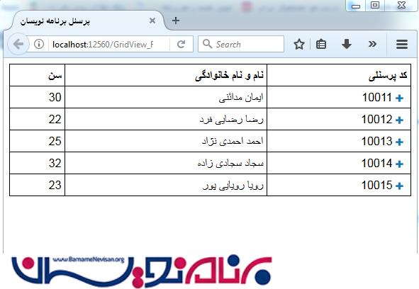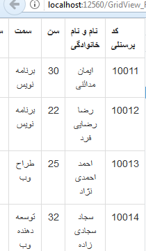 تا اینجا نتیجه کار شما در مرورگر چیزی شبیه به این خواهد بود. بخاطر داشته باشید که ممکن است با خطای مبنی بر نبودن رویدادی با نام grd_RowDataBound روبرو شوید که با برداشتن رویداد بصورت موقت این مشکل حل میشود. ما در ادامه grd_RowDataBound را خواهیم ساخت.