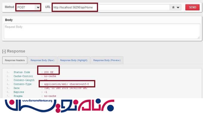 در تصویر بالا سرویس Web API REST ، متد HTTP Post پاسخ HTTP POST 200 Code Status را باز میگرداند به این معنی که سرویس REST با موفقیت اجرا شده است.