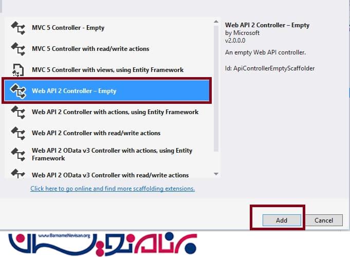 بر روی فولدر Controller کلیک راست کرده و Web API 2 Empty controller به صورت زیر ایجاد کنید.