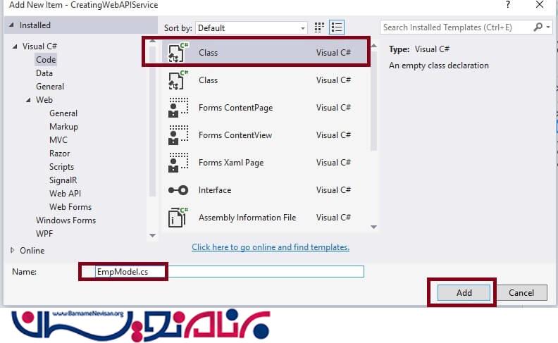 بر روی پوشه Model در برنامه Web API ایجاد شده راست کلیک کنید، نام کلاس را EmpModel یا هر نام دلخواه انتخاب کنید و روی OK کلیک کنید.