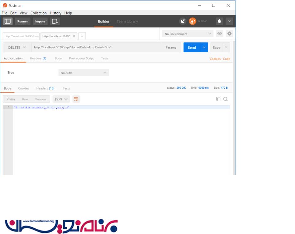 در تصویر بالا سرویس Web API REST ، متد HTTP Delete پاسخ Status برابر 200 OK است که به این معناست که سرویس REST با موفقیت اجرا شده است.