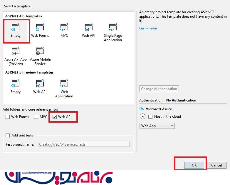 2)به آدرس File>New>Project>ASP.NET Web Application Template بروید و یک پروژه با نام دلخواه خود ایجاد کنید سپس پنجره زیر باز می شود. قالب empty را انتخاب کنید و گزینه Web API را مانند تصویر زیر تیک بزنید.