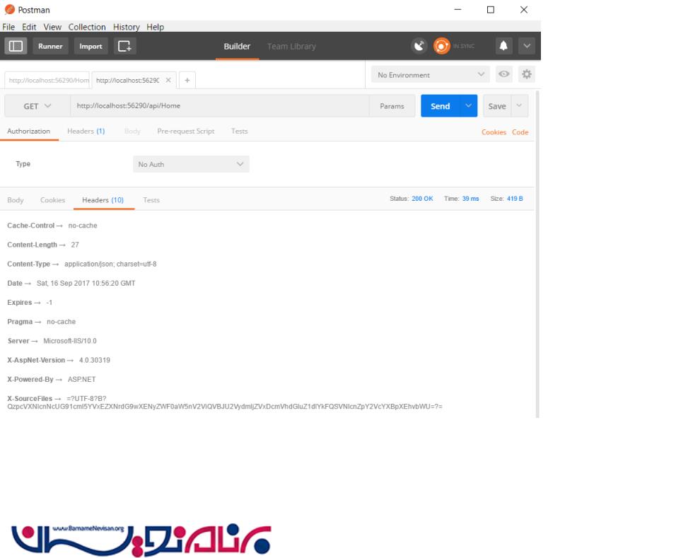 آدرس سرویس ما به صورت http://localhost:56290/api/Home است ، که در پایین به شرح آن میپردازیم.