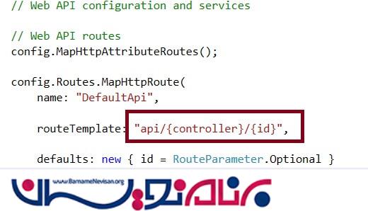 دلیل خطای فوق این است که ما از ساختار url که در مسیریابی برنامه web API قرار دارد پیروی نمی کنیم.در ادامه ساختار تعریف شده برای web API را که در فایل WebApiConfig.cs قرار دارد مشاهده میکنید: