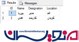 GO INSERT [dbo].[Employee] ([ID], [Name], [Designation], [Location]) VALUES (1, N'پوریا', N' مدیر', N'کیش') GO INSERT [dbo].[Employee] ([ID], [Name], [Designation], [Location]) VALUES (2, N'محمد', N' کارمند', N'تهران') GO
