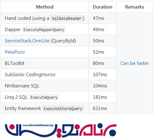 یکی از ویژگی های کلیدی Dapper عملکرد آن است. معیار های زیر نشان میدهد که چه مدت طول میکشد تا 500 SELECT از داده های DB را map و به objects مورد نظر ما برگشت داده شوند.