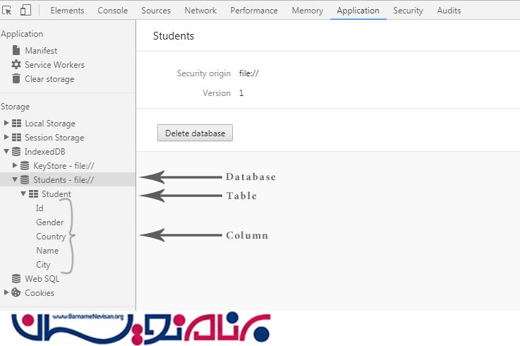 برای اینکه از ایجاد Database خود در مرورگر مطمئن شوید باید به بخش IndexedDB مراجعه نمایید.