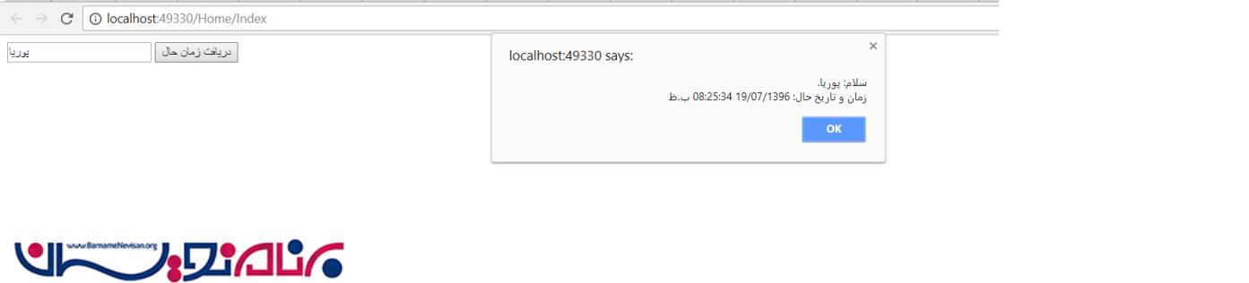 مقدار TextBox به عنوان پارامتر انتقال داده می شود و پاسخ بازگشت با استفاده از JavaScript Alert Message Box نمایش داده می شود.