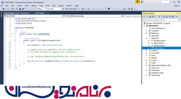 هنگامی که آن با موفقیت نصب شود، شما دو منبع اضافه شده به پروژه خود و یک کلاس UnityConfig.cs که در پوشه App-Start قرار میگیرد را همانند تصویر زیر مشاهده میکنید.