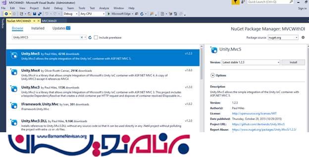 حالا ، کانتینر Unity.Mvc5 را با استفاده از NuGet Package Manager همانند تصویر زیر نصب کنید: