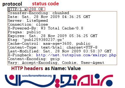پس از آن درخواست، مرورگر شما یک پاسخ HTTP دریافت می کند که ممکن است به صورت زیر باشد: