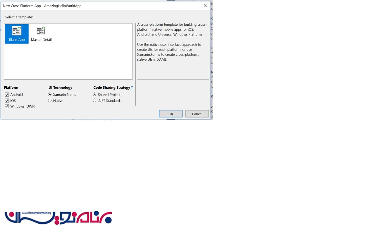 شما می توانید با یک برنامه جدید Xamarin.Forms با رفتن به File -> New -> Visual C # -> Cross-Platform -> Cross-Platform App شروع کنید. این الگو به شما اجازه می دهد که با چه نوع پروژه ای شروع کنید، چه سیستم عامل هایی موردهدف قرار دهید، و استراتژی به اشتراک گذاری کد خود را انتخاب کنید.