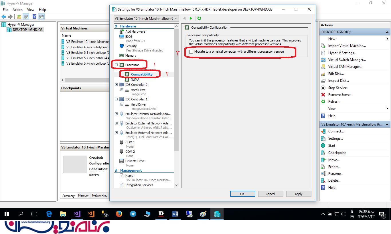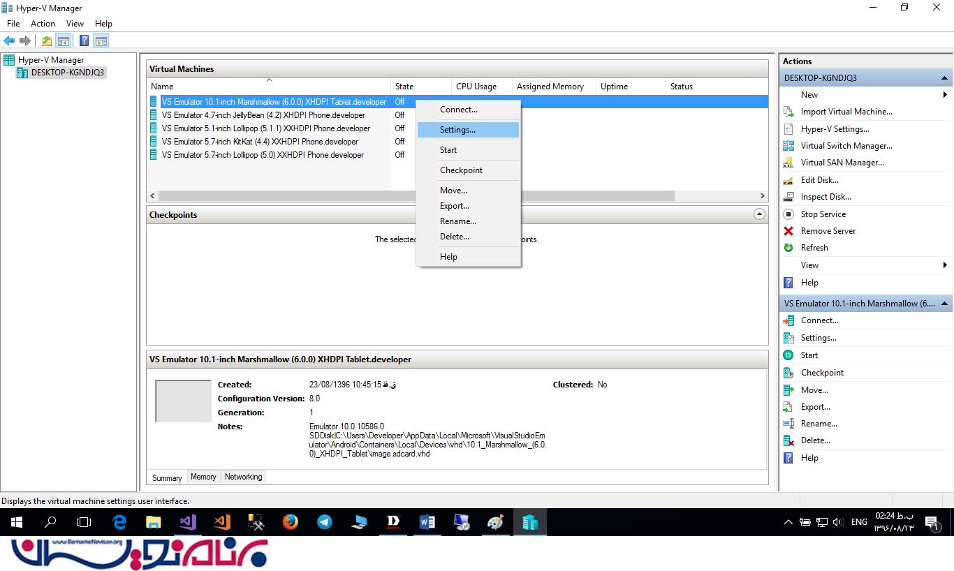 Hyper-V Manager -1را اجرا کنید، . مطابق شکل 7 تمام SDK هایی که توسط Visual Studio Emulator ساخته شده اند در این قسمت وجود دارند. هرکدام را که دوست دارید انتخاب و روی آن راست کلیک کنید، Settings را کلیک کنید. تنظیمات RAM، CPU و سایر تنظیمات در این قسمت قابل انجام می باشد.