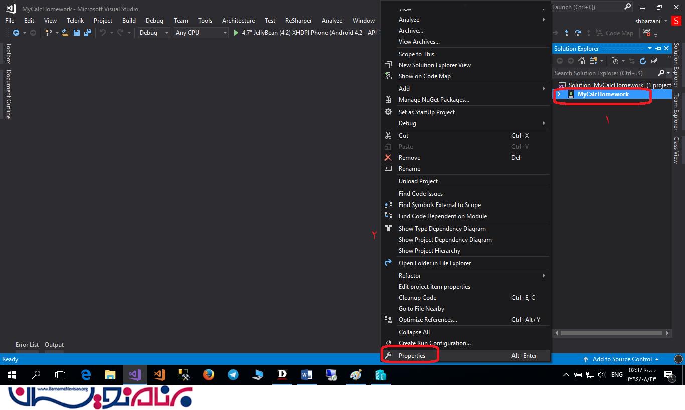 2- در ویژوال استودیو در قسمت Solution Explorer مطابق شکل 9 روی نام پروژه راست کلیک و Properties را انتخاب کنید.