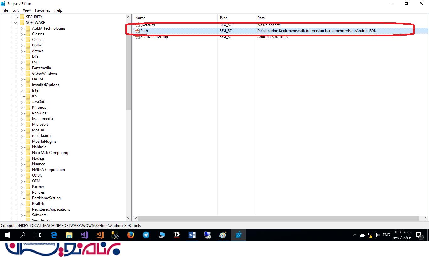 در ابتدا لازم است مطابق شکل 1 ، شکل 2 و شکل 3 مسیر محل نصب Android SDK را هم در داخل برنامه و هم در رجیستری ویندوز بررسی کنید. هردو مسیر باید درست باشد و محلی که فایلهای SDK شما در آن قرار دارد را نشان دهد.
