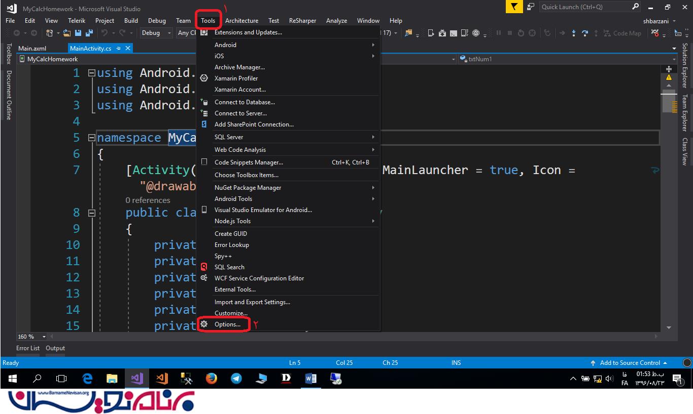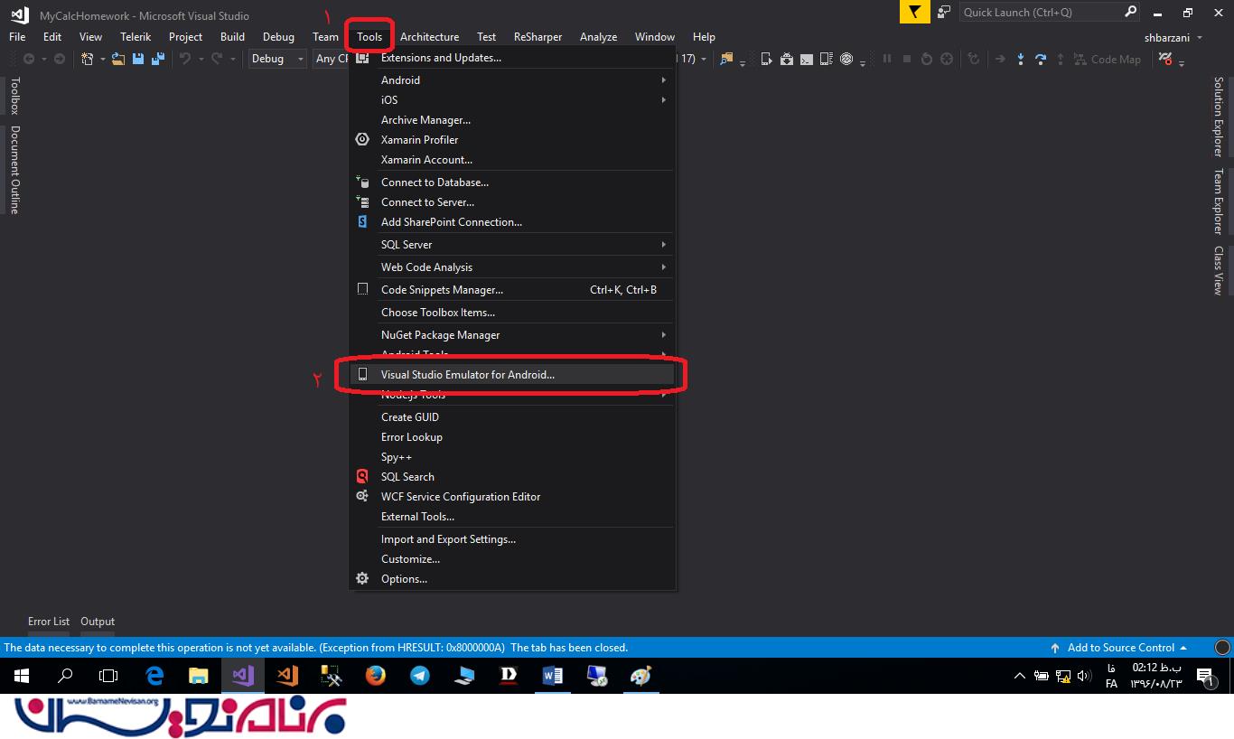 حالا مطابق شکل 5 و شکل 6 به ویژوال استودیو بروید و Visual Studio Emulator For Android را از منوی tools انتخاب کنید.