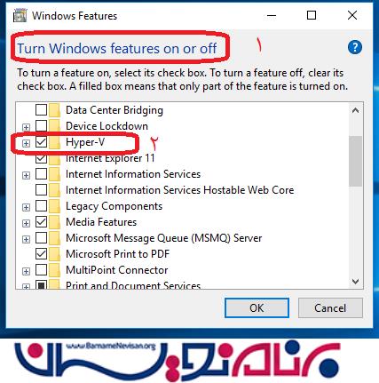 همانطور که میدانید Emulator Visual Studio برای اجرا به ماشین مجازی ویندوز نیاز دارد، برای فعال سازی آن مطابق شکل 4 به Turn Windows Feature on or off بروید و تیک Hyper-V را بزنید.