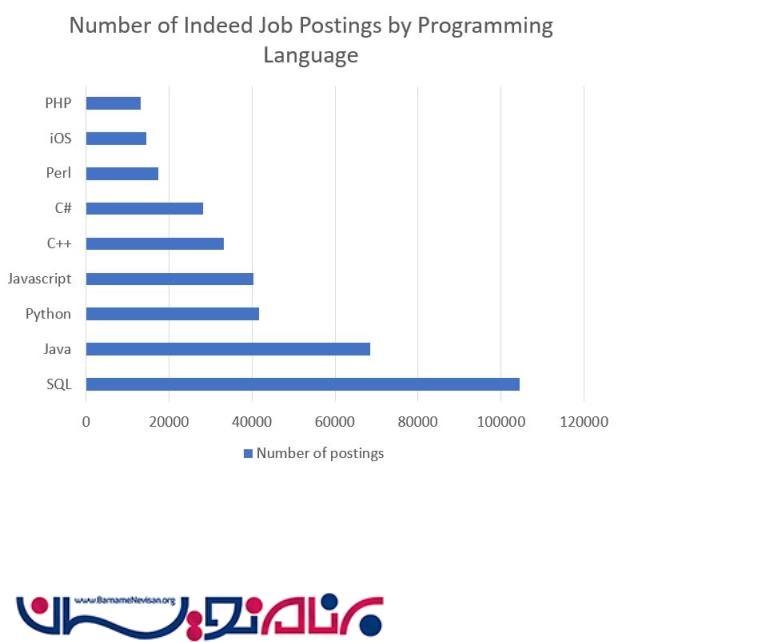 تعدادی از شغلهای حاصل از جستجوی Indeed شامل SQL (Structured Query Language) بود که نسبت به سال گذشته نزدیک به 50000 تا افزایش داشته. معلوم نیست که این افزایش به خاطر بیشتر شدن شغلهای SQL در بازاره یا نحوه کار شغلهای موجود در Indeed تغییر کرده. به هر حال SQL هنوز سردسته تحلیل ماست. SQL برای برقراری ارتباط با بانکهای اطلاعاتی و دستکاری اونها استفاده میشه. این زبان با یک سری تغییرات مثل MySQL و Microsoft SQL بسیار رایجه. مایکروسافت در سال گذشته SQL Server 2016 را منتشر کرد، که به طرز شگفتانگیزی محبوبیت پیدا کرد و چندین ویژگی جدید را برای ایجاد زبان open-source، مثل ترکیب با R، زبان برنامهنویسی محبوب تحلیل داده، و یک نسخه لینوکس معرفی کرد.