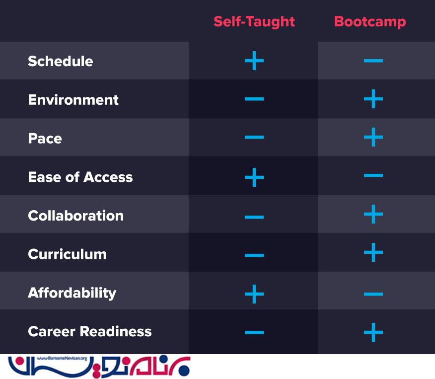 وقتی بحث گزینش شغلی پیش میآید، محیطهای آنلاین کمی سخت است و میتوانید برنامهنویسی بوت کمپ را انتخاب کنید، به خصوص افرادی که پیشزمینهای از کدنویسی ندارند. در عرض فقط سه ماه، بوت کمپ توانست دانش فنی بیشتری را در من ایجاد کند، تا ده ماه خودآموزی خودم.