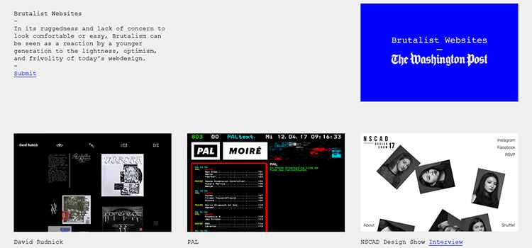 بروتالیسم برای سایتهایی مناسب است که نسل جوان را هدف قرار میدهند. این سبک از عناصری مثل عدم فنون طراحی، تصویر زمینههای پر رنگ و جسورانه، تایپوگرافیهای یکپارچه، عدم فضای خالی، اشتباهات عینی، عدم تقارن و طرحهای نامناسب دیگری که متضاد وبسایتهای لایت، تمیز و زیبا در طراحی مدرن است استفاده میکند.