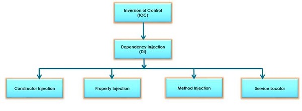 IOC (Inversion of Control) و تزریق وابستگی برای حذف وابستگی برنامه ایجاد می شوند. این امر باعث می شود که اجزای سیستم بیشتر از هم جدا و قابل نگهداری باشند. تزریق وابستگی یک الگوی طراحی است که نحوه ایجاد کلاس های متصل به هم را بدون محدودیت نشان می دهد. این الگو از سازنده شیء استفاده می کند تا اشیاء را راه اندازی اولیه (initialize) کرده و وابستگی های مورد نیاز شیء را فراهم کند، به این معنا که به توسعه دهندگان اجازه می دهد تا وابستگی را از خارج کلاس تزریق کنند. چهار راه برای دستیابی به تزریق وابستگی وجود دارد. شکل 1 آن ها را توضیح می دهد.