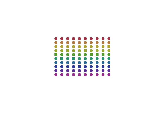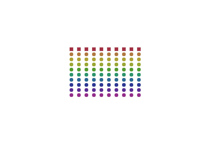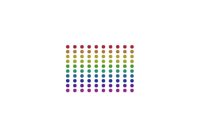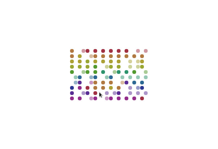 تمام کد جاوااسکریپت خود را داخل این تابع قرار میدهیم. میخواهیم یک عنصر تعاملی ساده بسازیم که در آن شبکهای (grid) از اشکال رنگی وجود داشته باشد که با کاربر در تعامل باشند و با حرکت موس حرکت کنند. عنصری با 10 خانه در عرض و ارتفاع، با رنگهای پالت رنگین کمان میسازیم: