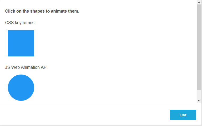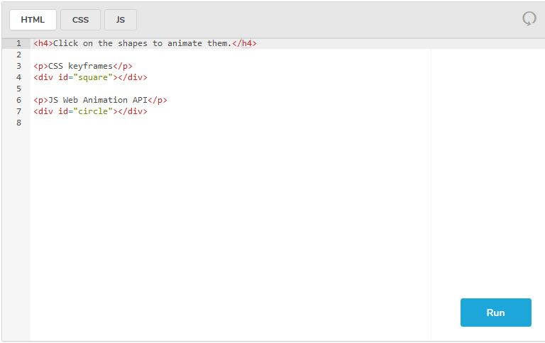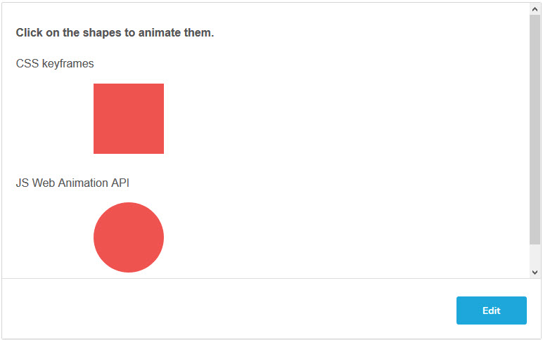 ویرایشگر پایین دارای دو div است که در هنگام کلیک به سمت راست حرکت داده میشوند و همزمان رنگ آنها نیز عوض میشود. مربع با استفاده از CSS Keyframe متحرک شده و دایره نیز با استفاده از JS Web Animations API.