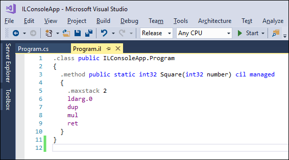 ویژوال استودیو چیزی در مورد تعریف متد Square() در IL نمیداند ما باید به آن بگوییم که متدی همانند این وجود دارد، اما قبلا تعریف شده است. کلمه کلیدی extern میگوید که متدی به نام Square() در این کلاس وجود دارد اما در جای دیگری تعریف شده است. اتربیوت MethodImpl با ForwardRef میگوید این متد قبلا تعریف شده است، بنابراین نیازی نیست تا در این مرحله به دنبال آن بگردد.