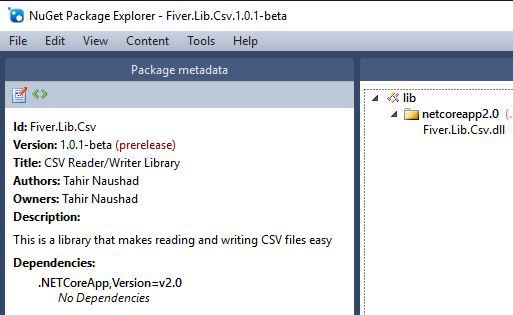 <PropertyGroup> <Authors>Tahir Naushad</Authors> <Title>CSV Reader/Writer Library</Title> <Description>This is a library that makes reading and writing CSV files easy</Description> <VersionPrefix>1.0.1</VersionPrefix> <VersionSuffix>beta</VersionSuffix> </PropertyGroup>