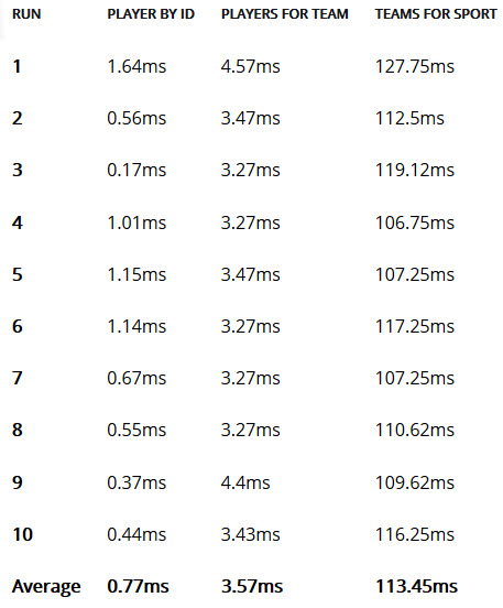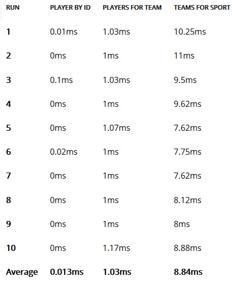توجه داشته باشید که در مورد Dapper.NET و ADO.NET، یک سطر را برای هر بازیکن در کوئری GetTeamsForSport انتخاب خواهیم کرد. این یک مقایسه دقیق در برابر کوئری EF نیست، اما برای هدفی که ما داریم به خوبی کار میکند.
