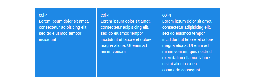 سایزبندی ستونها به صورت مساوی در فضای موجود انجام شده، و همواره تمام سطر پر میشود. اگر بخواهیم یک ستون بزرگتر یا کوچکتر باشد، میتوانیم با کلاس col-size. این کار را انجام دهیم.