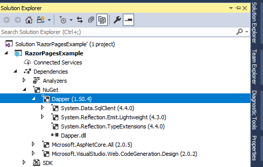 نصب Dapper یک گام ساده است روی پروژه راست کلیک کنید و “Manage NuGet Packages” را انتخاب کنید یک NuGet Package Manager باز خواهد شد که از آنجا می توانید پکیج هایی که نیاز دارید را جستجو کنید بنابراین ما “Dapper” را جستجو و نصب خواهیم کرد. پس از نصب در قسمت NuGet که در قسمت “Dependencies” قرار دارد پکیج به صورت زیر در پروژه نشان داده خواهد شد.