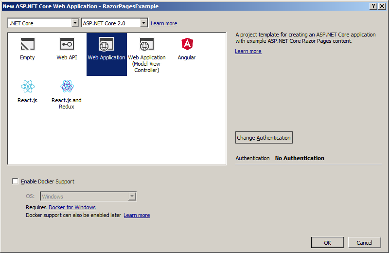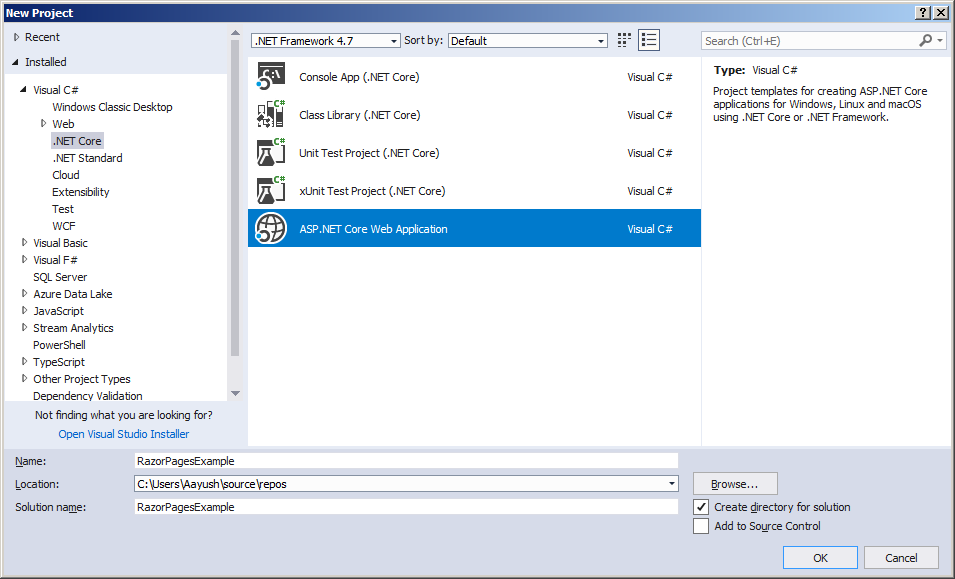 امیدوارم آخرین نسخه ی Visual Studio به همراه Net Core SDK 2.0. را نصب کرده باشید. بنابراین Visual Studio را باز کنید و به File Menu > choose New > select Project بروید با این کار یک پنجره ی “New Project” باز خواهد شد. از پنجره ی New Project باید Net Core. را از پنل سمت چپ انتخاب کنید و سپس از پنل وسط “Asp.Net Core Web Application” را انتخاب کنید و یک نام مناسب نظیر “RazorPagesExample” بگذارید و روی OK کلیک کنید.