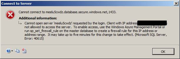 ما یک خطای جدید داریم که به معنی این است که به دلیل قانون firewall ، با این آدرس IP قادر به دسترسی به SQL server تعریف شده نیستیم.
