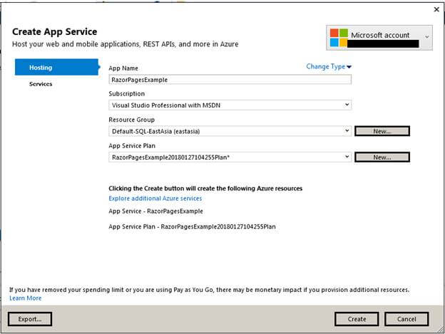 پنجره ی بعدی گزینه های مختلفی برای تنظیم یک محیط هاست و سرویس های آن دارد. زیر قسمت “Hosting” می توانیم نام اپلیکیشن خود را تعریف کنیم “App Name”. این نام برای دسترسی به اپلیکیشن از مرورگر استفاده می شود، حال طرح اشتراکی خود را تعریف کردیم طبق آن می توانیم اپلیکیشن و گروه منابع آن را SQL server منتشر کنیم.
