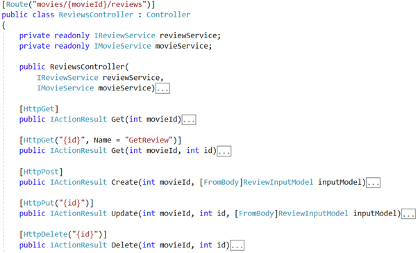 ما همچنین می توانیم URI های تودرتو نیز تعریف کنیم برای مثال در ادامه یک Reviews controller وجود دارد که برای هر فیلم صفر یا تعداد بیشتری بازبینی ممکن است وجود داشته باشد: