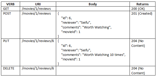 توجه کنید که شناسه برای منبع والد (فیلم) بخشی از ریشه است و می تواند بخشی از اکشن متد نیز باشد. URI زیر به controller دسترسی خواهد داشت:
