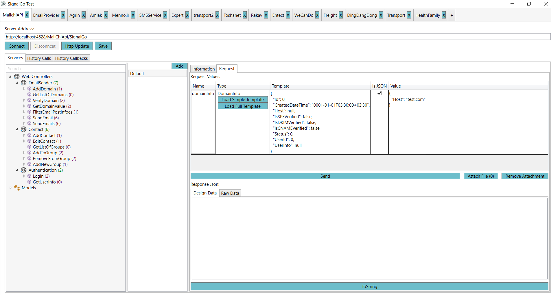علاوه بر همه ی اینها برنامه نویس سرور میتونه از ابزار SignalGo test که در بالا عکسش رو میبینید در قالب یک کلاینت کامل توابع و سرویس هاشو صدا بزنه بدون اینکه نیاز به وجود و یا برنامه نویسی یک کلاینت جدید باشه.
